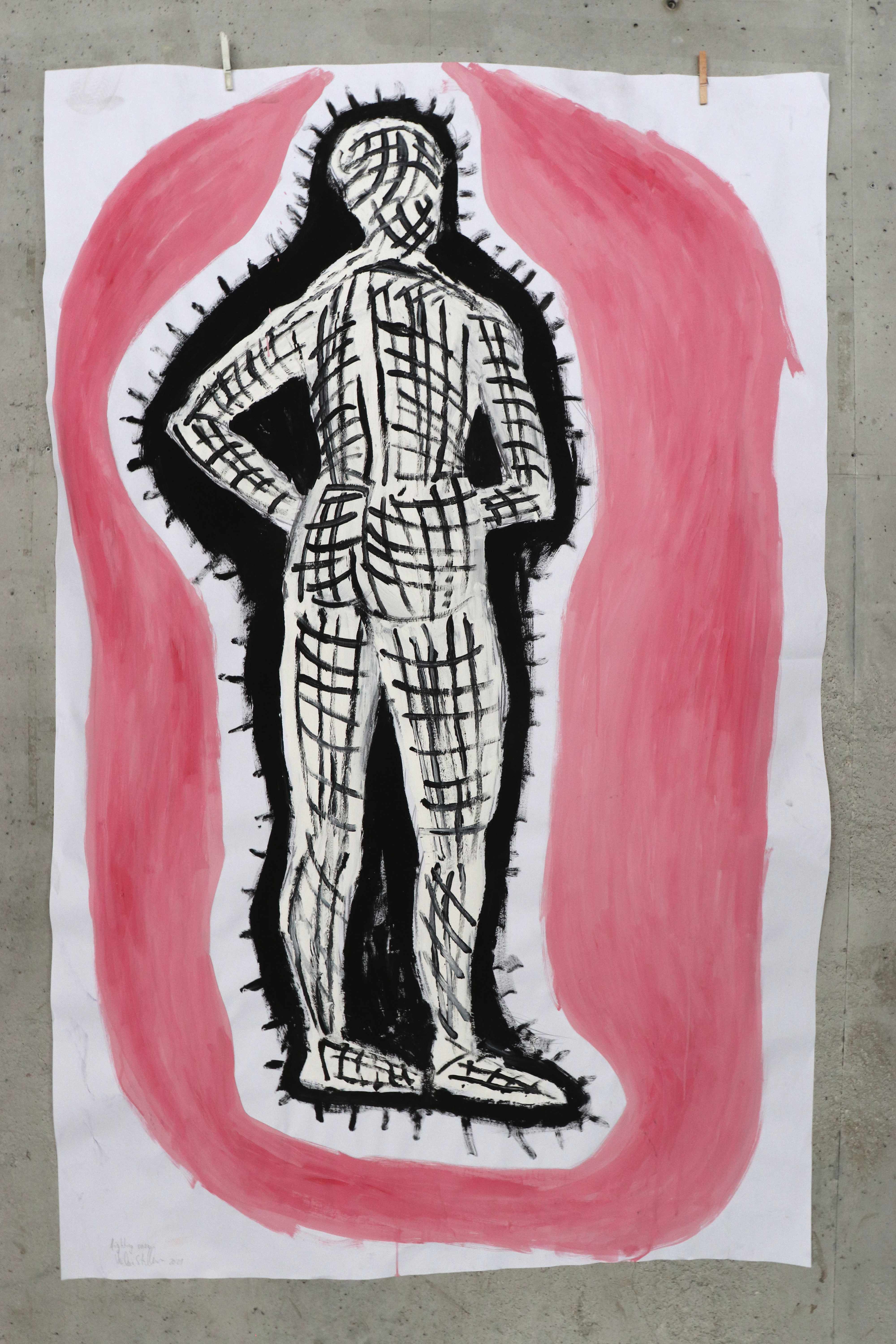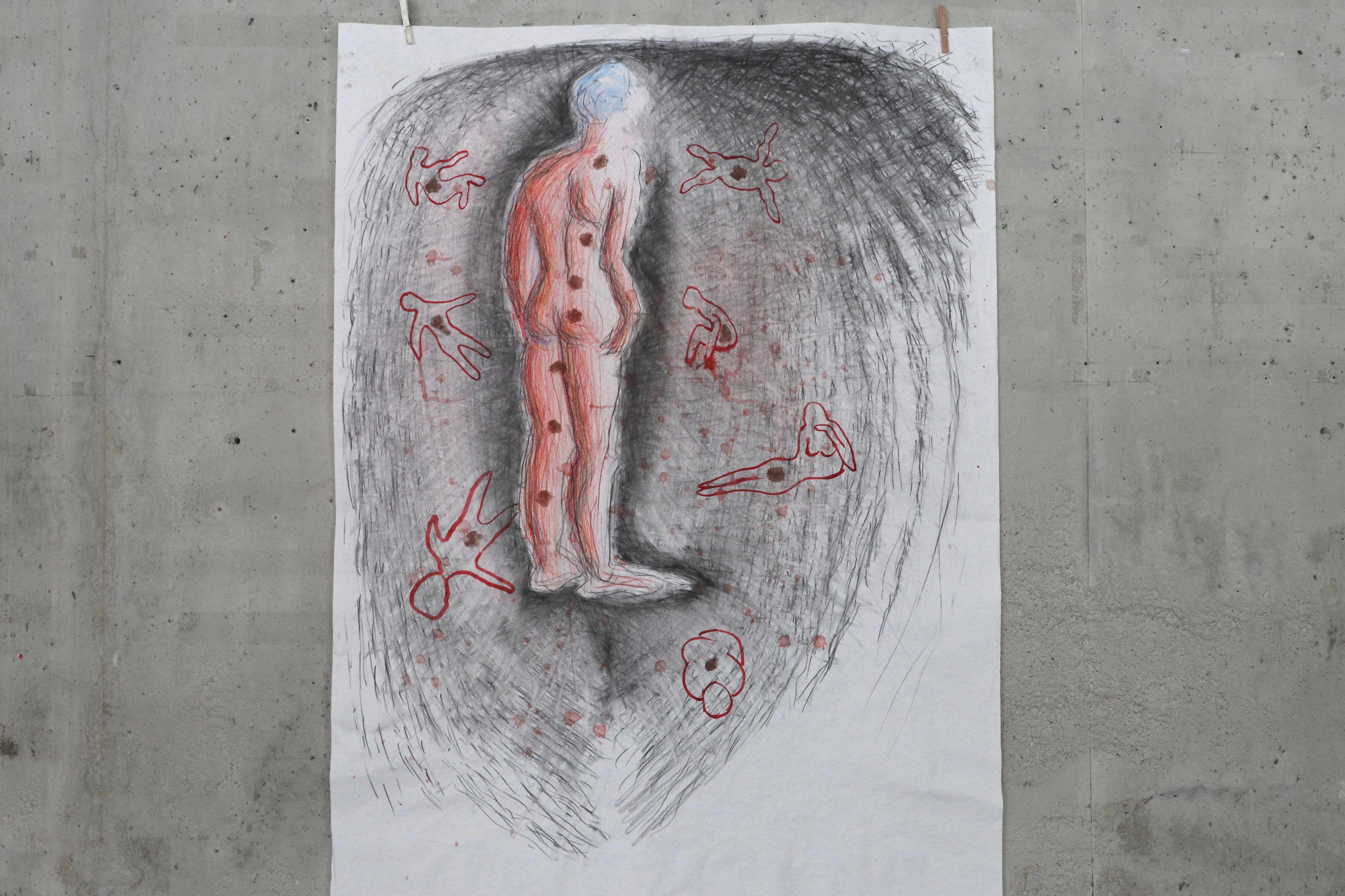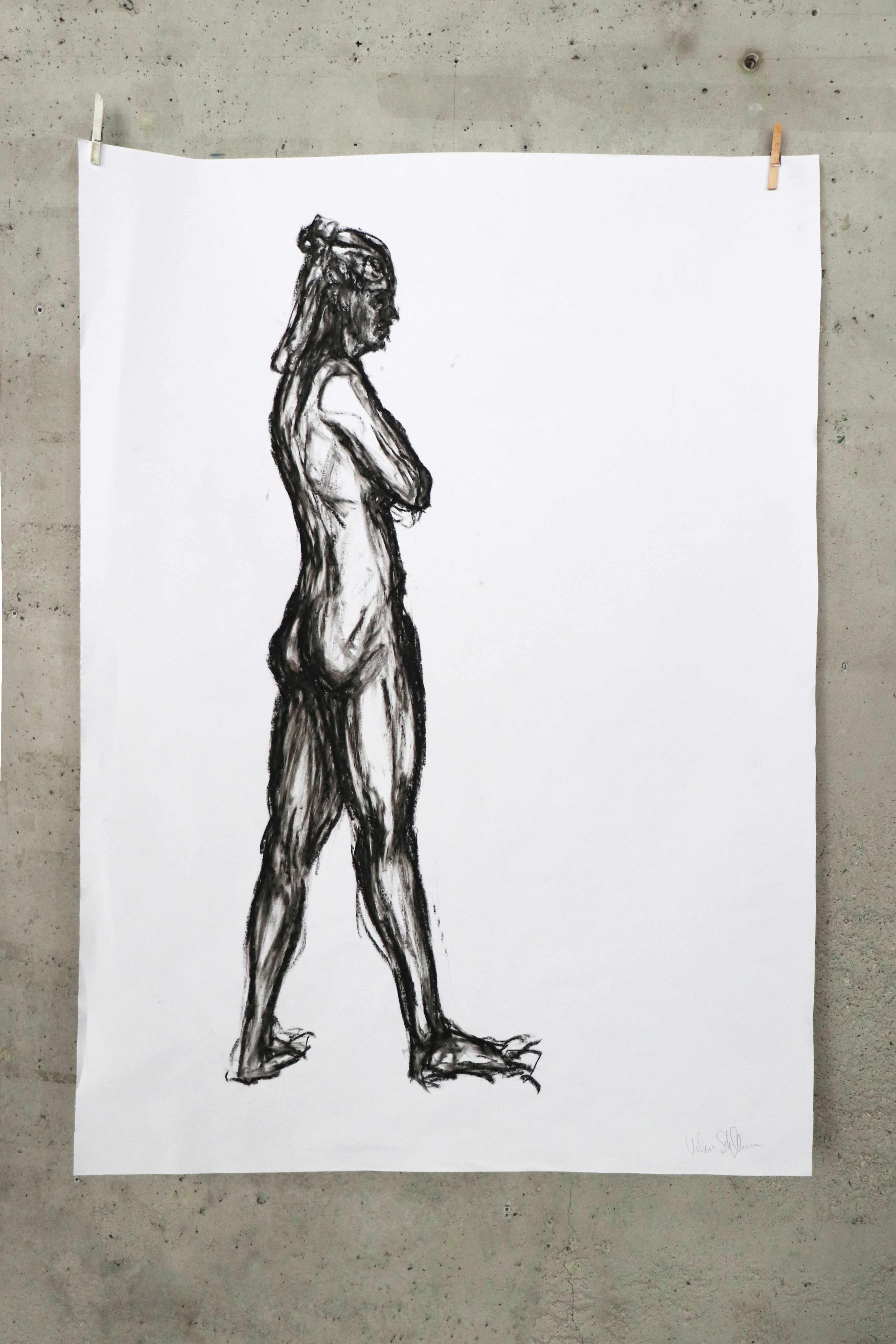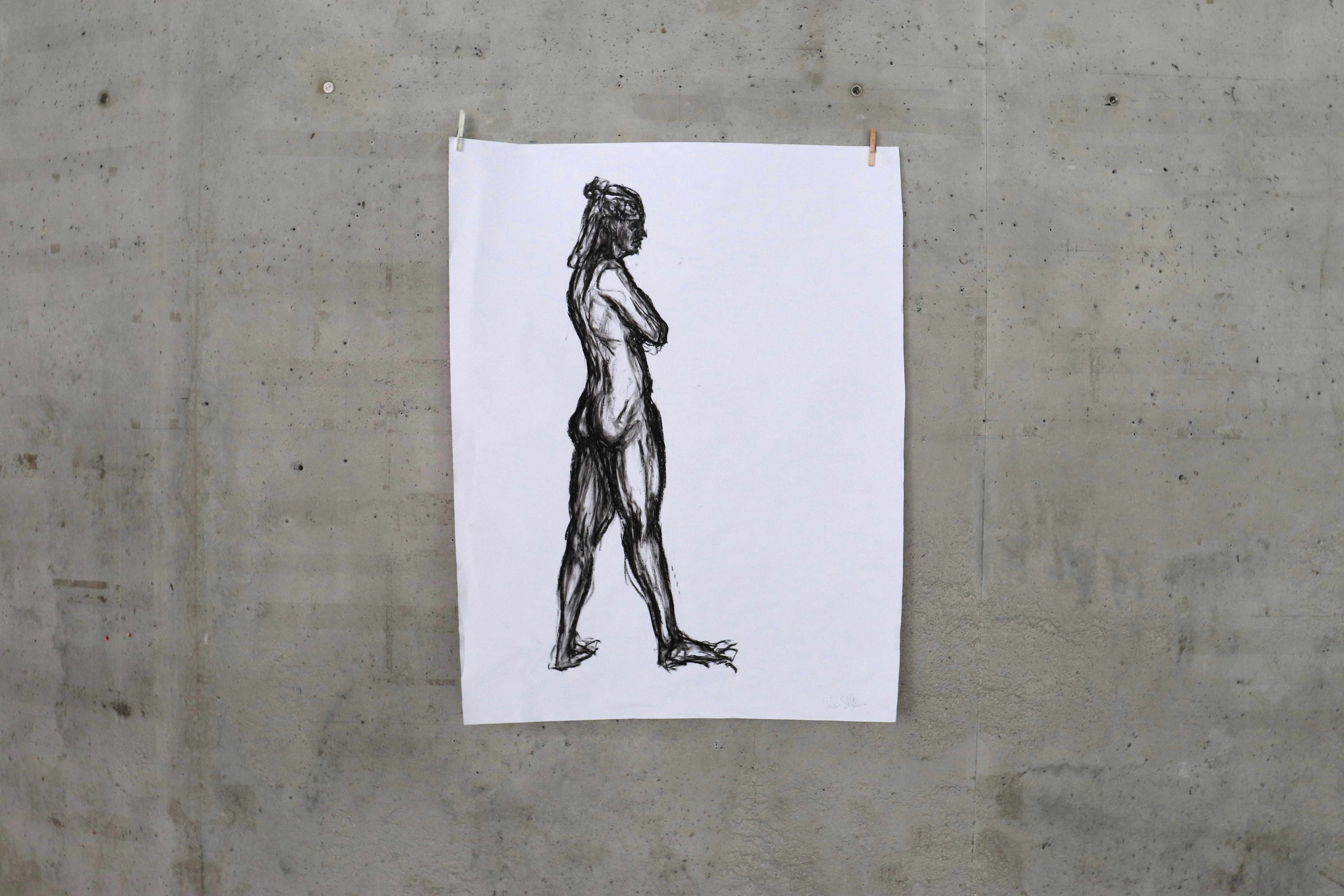 Das im Zuge eines Aktkurses entstandenes Werk, stellt eine weibliche stehende Figur dar. Die Strichführung ist expressiv und hektisch, ein körperliches Volumen wird durch das radieren von Linien gegeben. Die Figur ist im Profil dargestellt und steht breitbeinig mit verschlossenen Armen auf der linken Blattseite und blickt nach rechts. Der Charakter der Person scheint entschlossen, da ihre Körperhaltung kaum Spannung aufweist. Der Kontrast der schwarzen Linie auf weißem Blatt Papier gibt ein dramatisches Bild; eine schwarz auf weiß gegebene Tatsache. Trotzdem scheint der Körper durchsichtig zu sein, da manche Stellen in der Figur bewusst weiß gelassen worden sind. Die Komposition fußt auf ein dreieckiges Gebilde, dessen Spitze der Kopf ist. Die Zeichnung hat keinen Hitergrund, die Leere welche diese Figur umgibt zieht die Figur aus jeglicher Realität heraus und lässt sie in einem Nichts schweben. Die Zeichnung, also die Darstellung an sich, sowie die Entscheidungen dieser bestimmten Technik, können als Reaktion für die pandemiebedingte Situation stehen und wiederspiegeln das Rätsel des Seins.