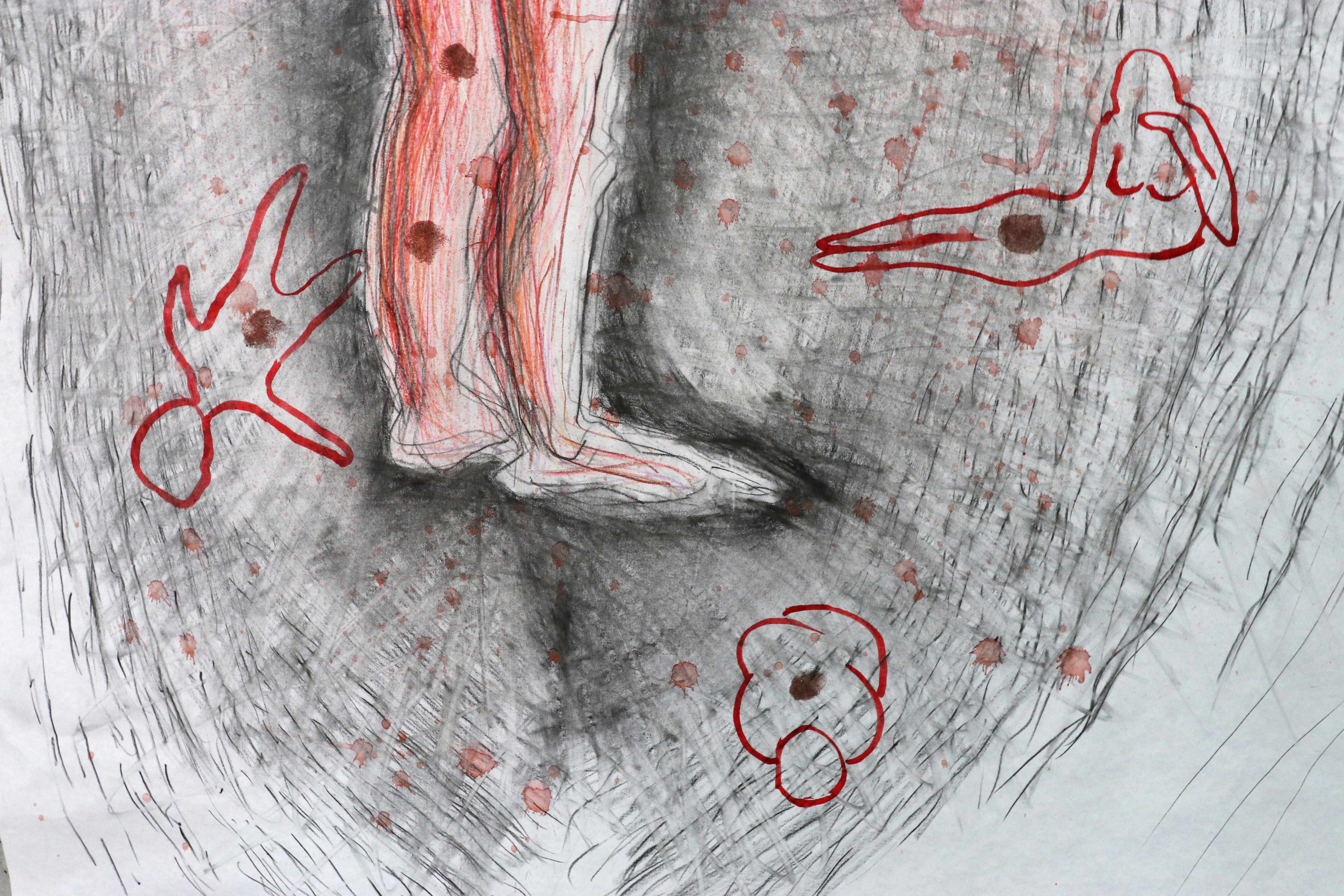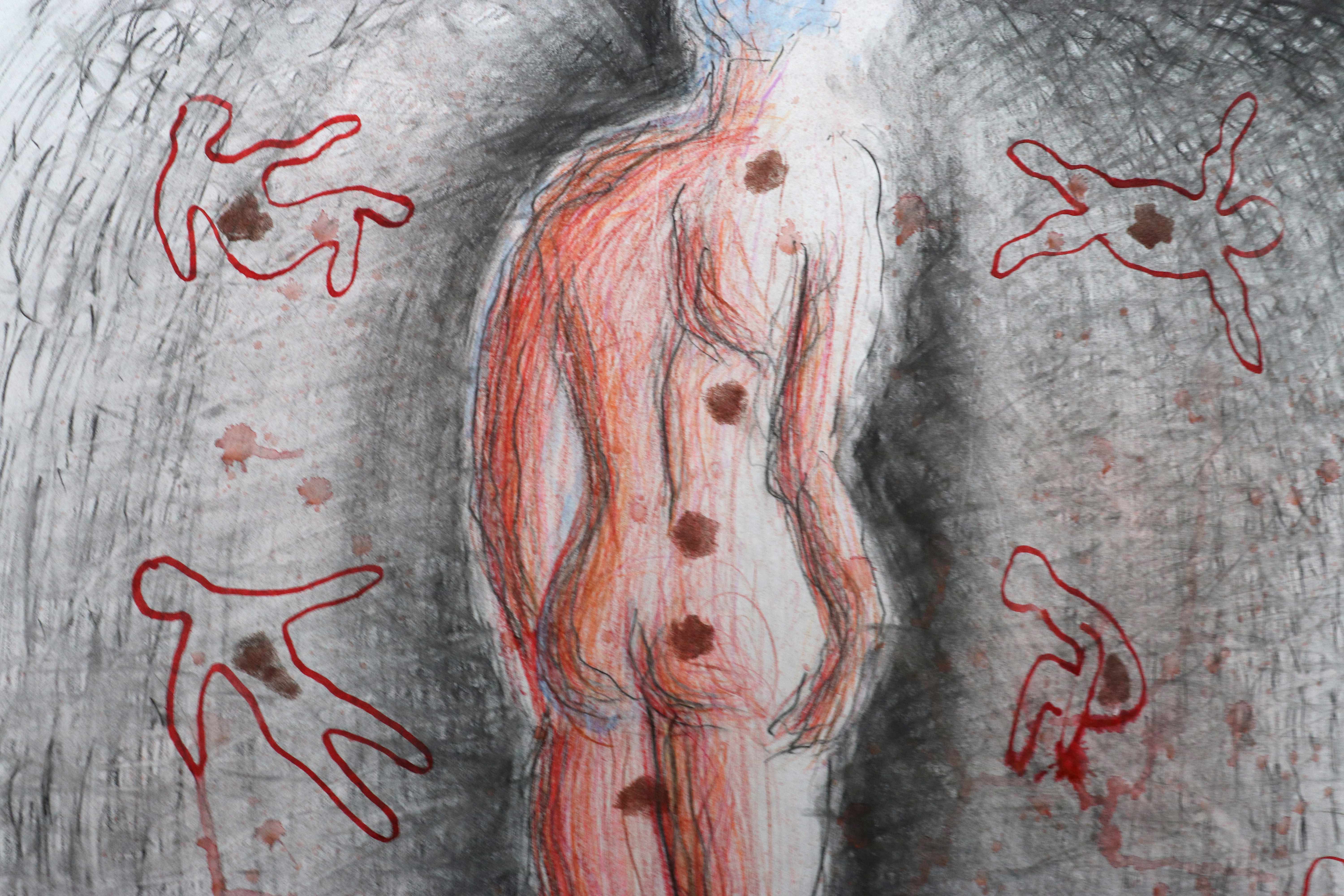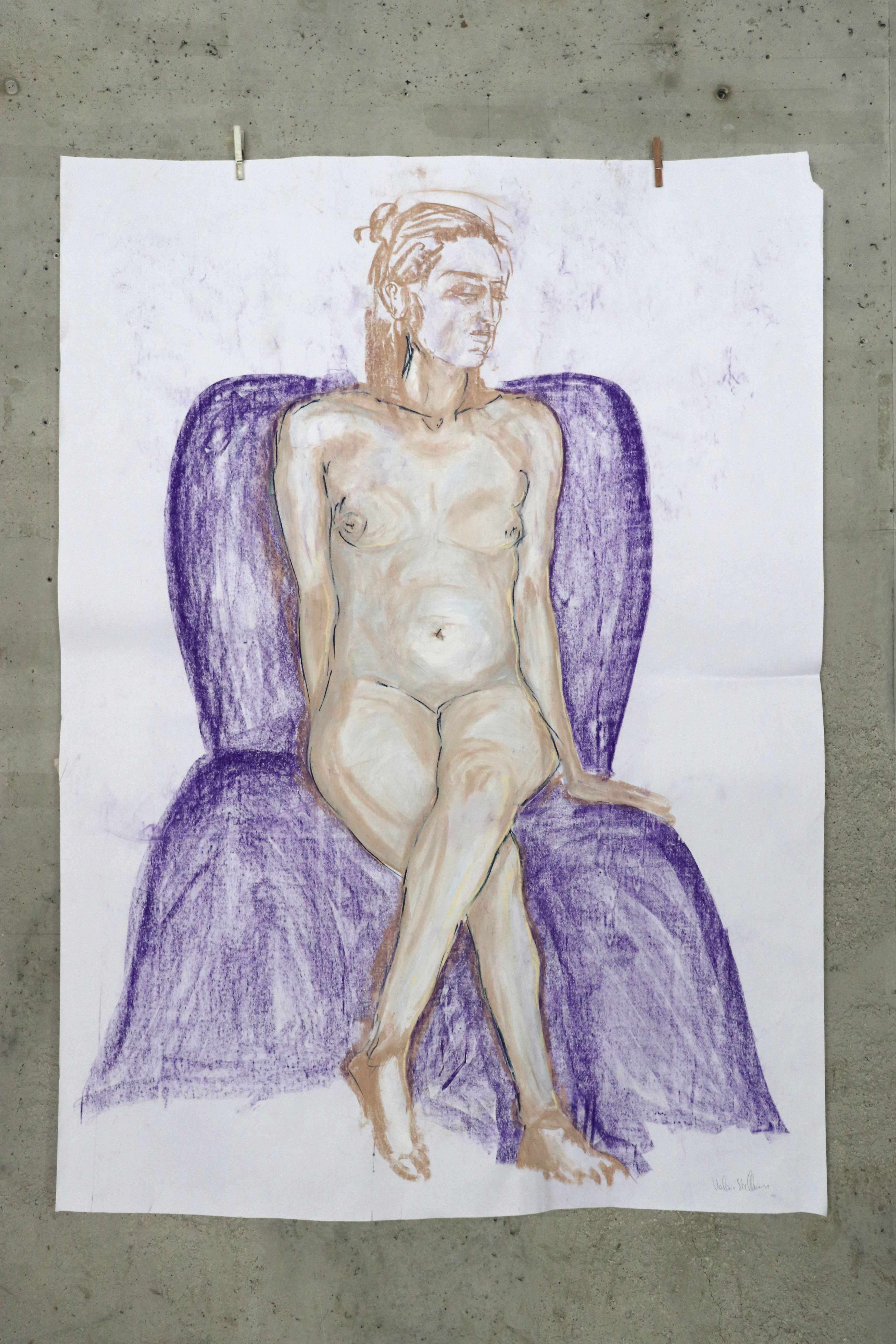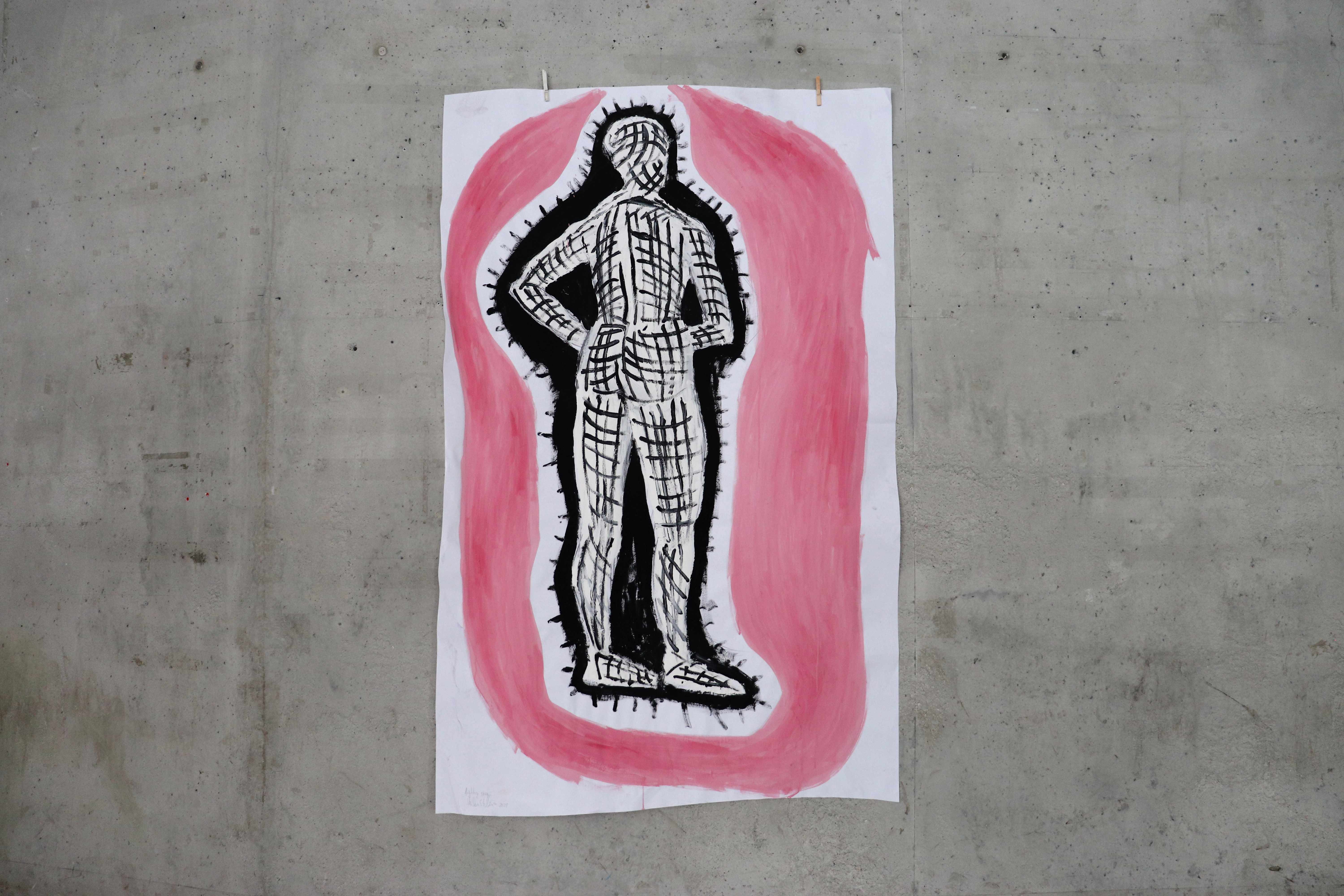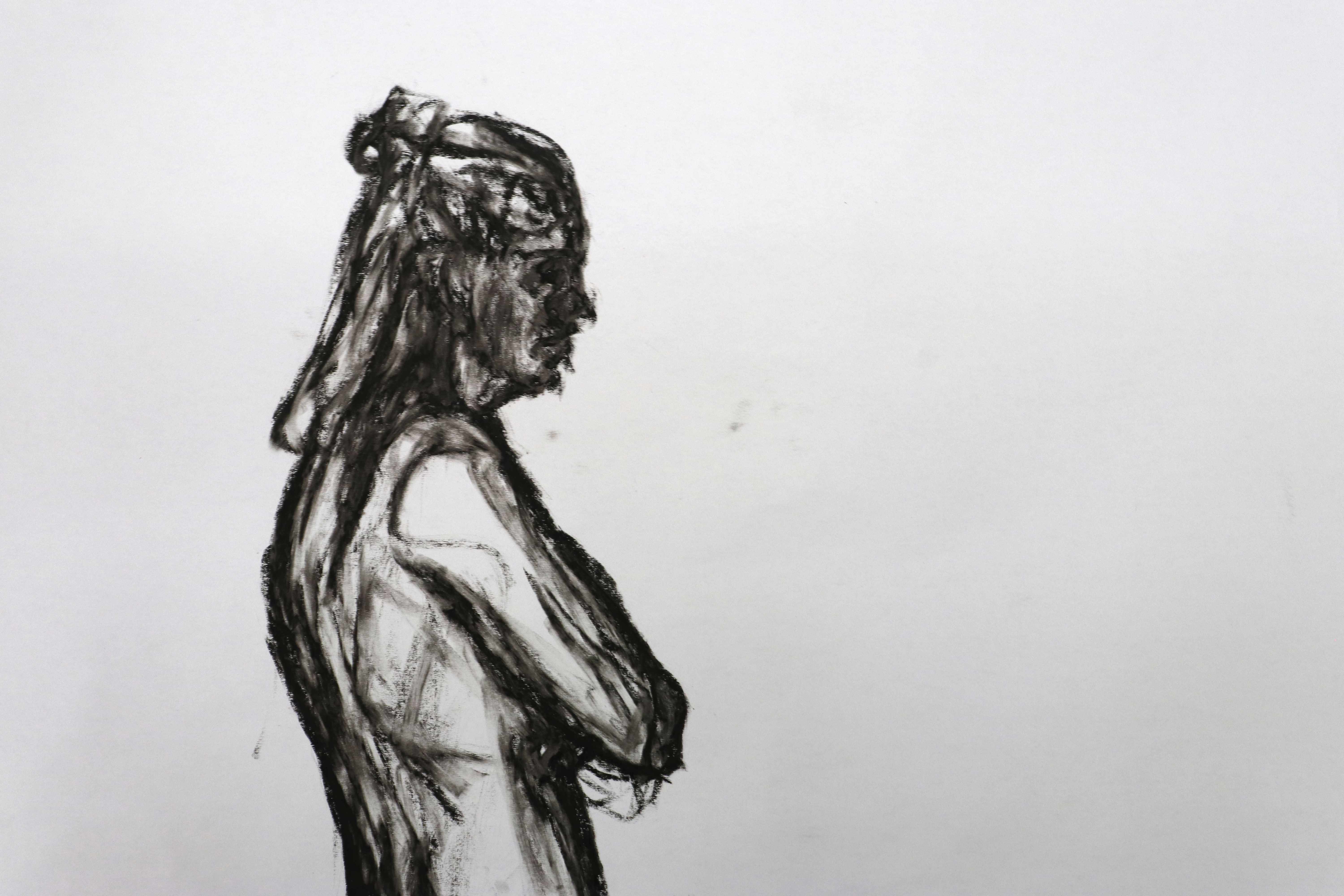 Das im Zuge eines Aktkurses entstandenes Werk, stellt eine weibliche stehende Figur dar. Die Strichführung ist expressiv und hektisch, ein körperliches Volumen wird durch das radieren von Linien gegeben. Die Figur ist im Profil dargestellt und steht breitbeinig mit verschlossenen Armen auf der linken Blattseite und blickt nach rechts. Der Charakter der Person scheint entschlossen, da ihre Körperhaltung kaum Spannung aufweist. Der Kontrast der schwarzen Linie auf weißem Blatt Papier gibt ein dramatisches Bild; eine schwarz auf weiß gegebene Tatsache. Trotzdem scheint der Körper durchsichtig zu sein, da manche Stellen in der Figur bewusst weiß gelassen worden sind. Die Komposition fußt auf ein dreieckiges Gebilde, dessen Spitze der Kopf ist. Die Zeichnung hat keinen Hitergrund, die Leere welche diese Figur umgibt zieht die Figur aus jeglicher Realität heraus und lässt sie in einem Nichts schweben. Die Zeichnung, also die Darstellung an sich, sowie die Entscheidungen dieser bestimmten Technik, können als Reaktion für die pandemiebedingte Situation stehen und wiederspiegeln das Rätsel des Seins.