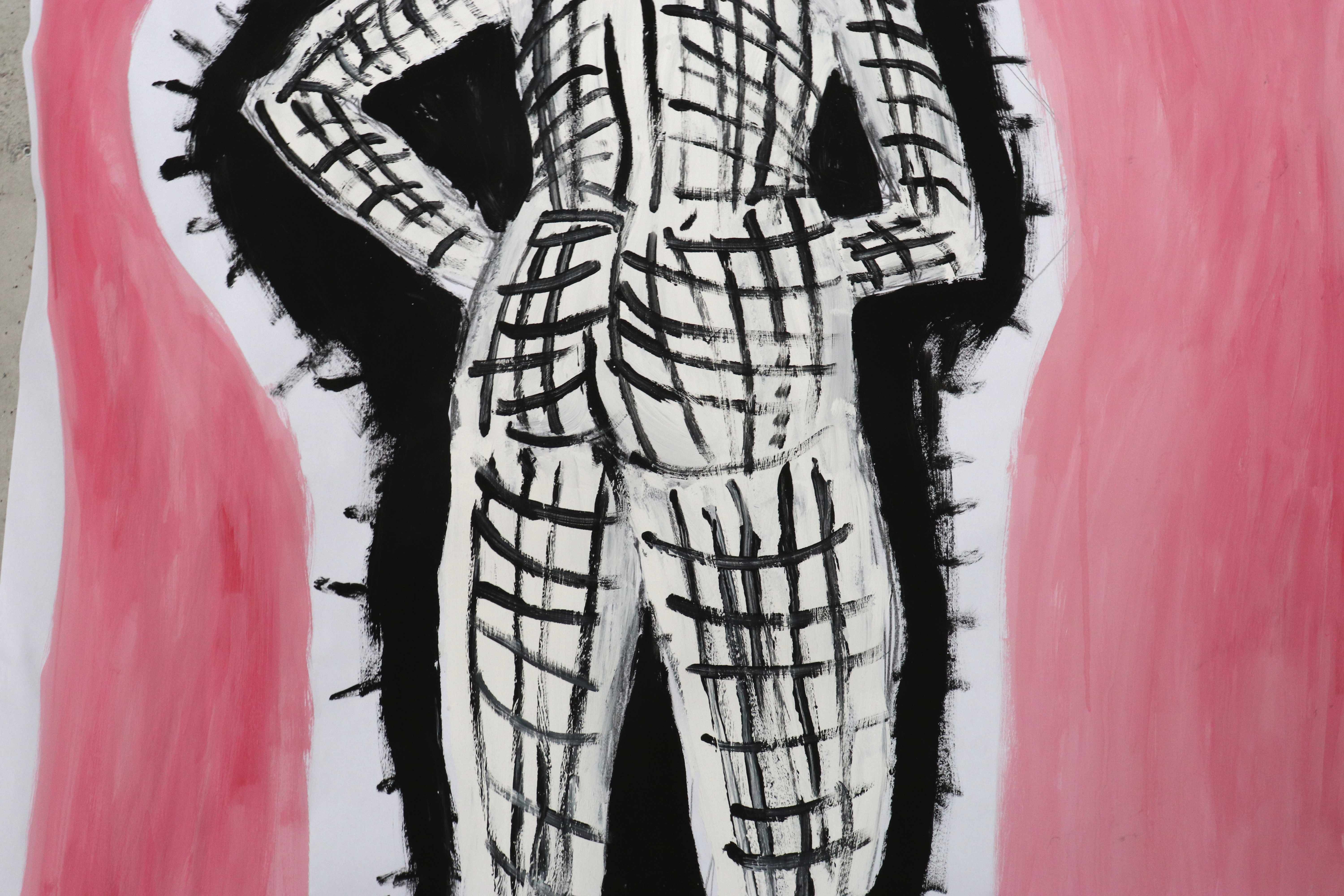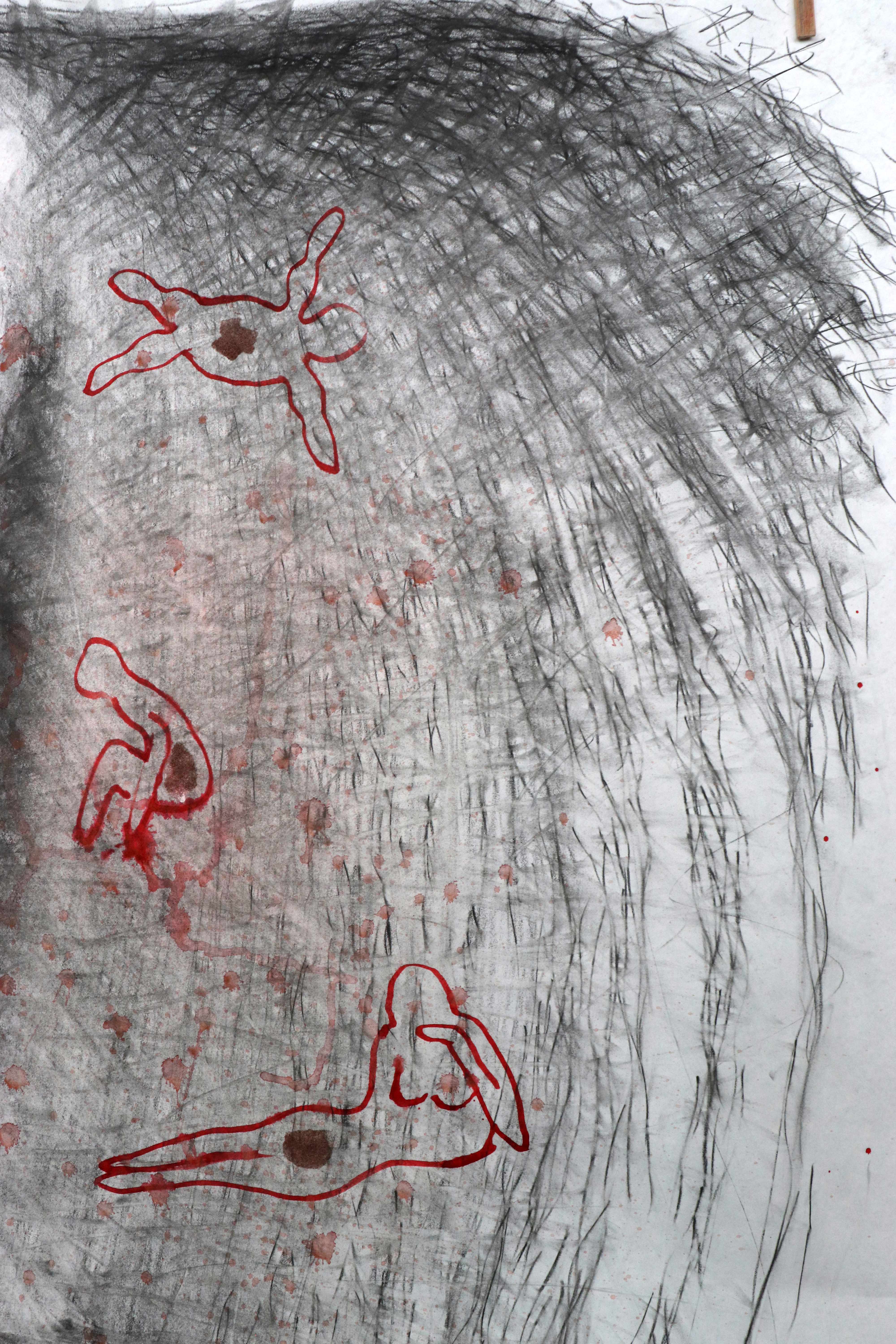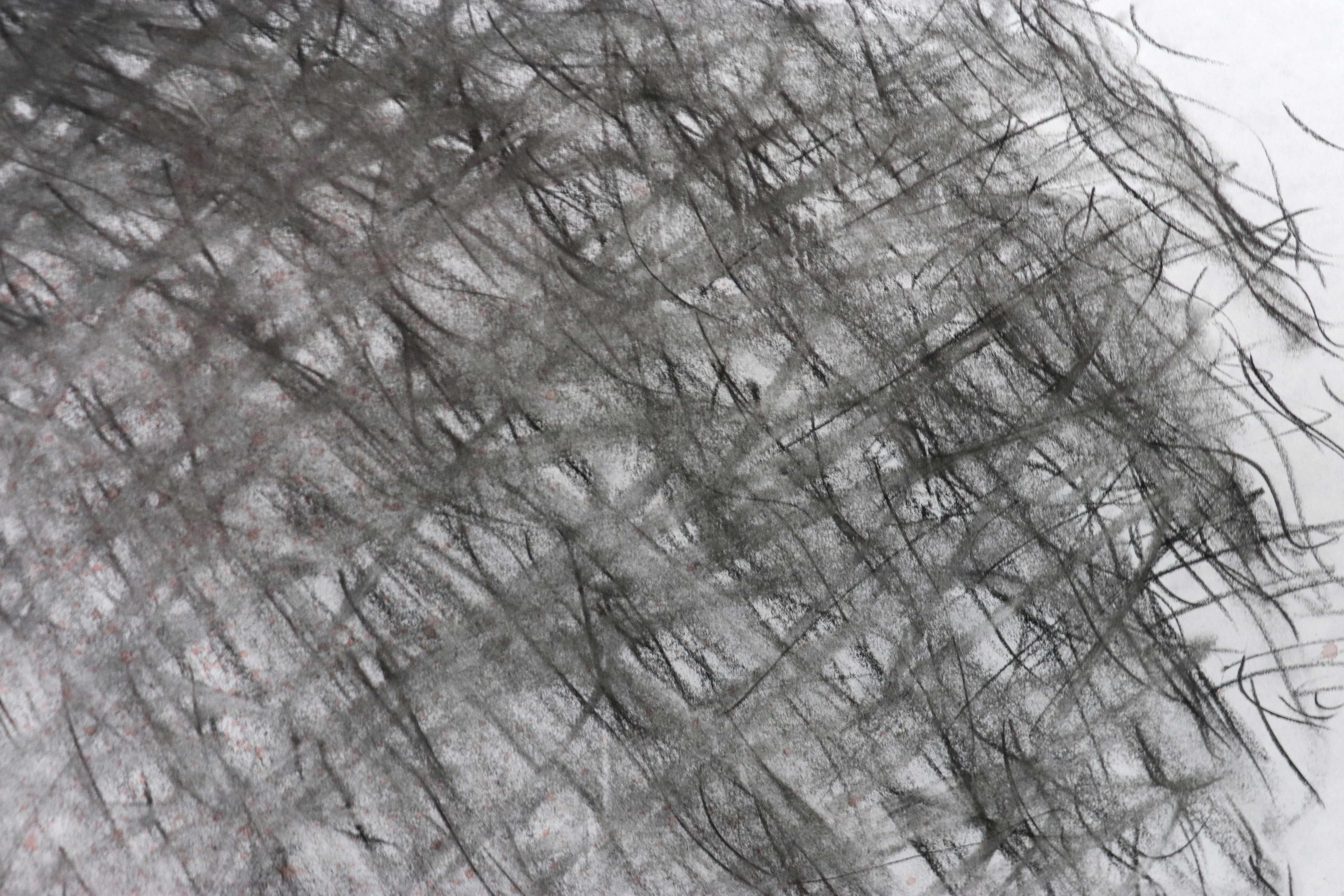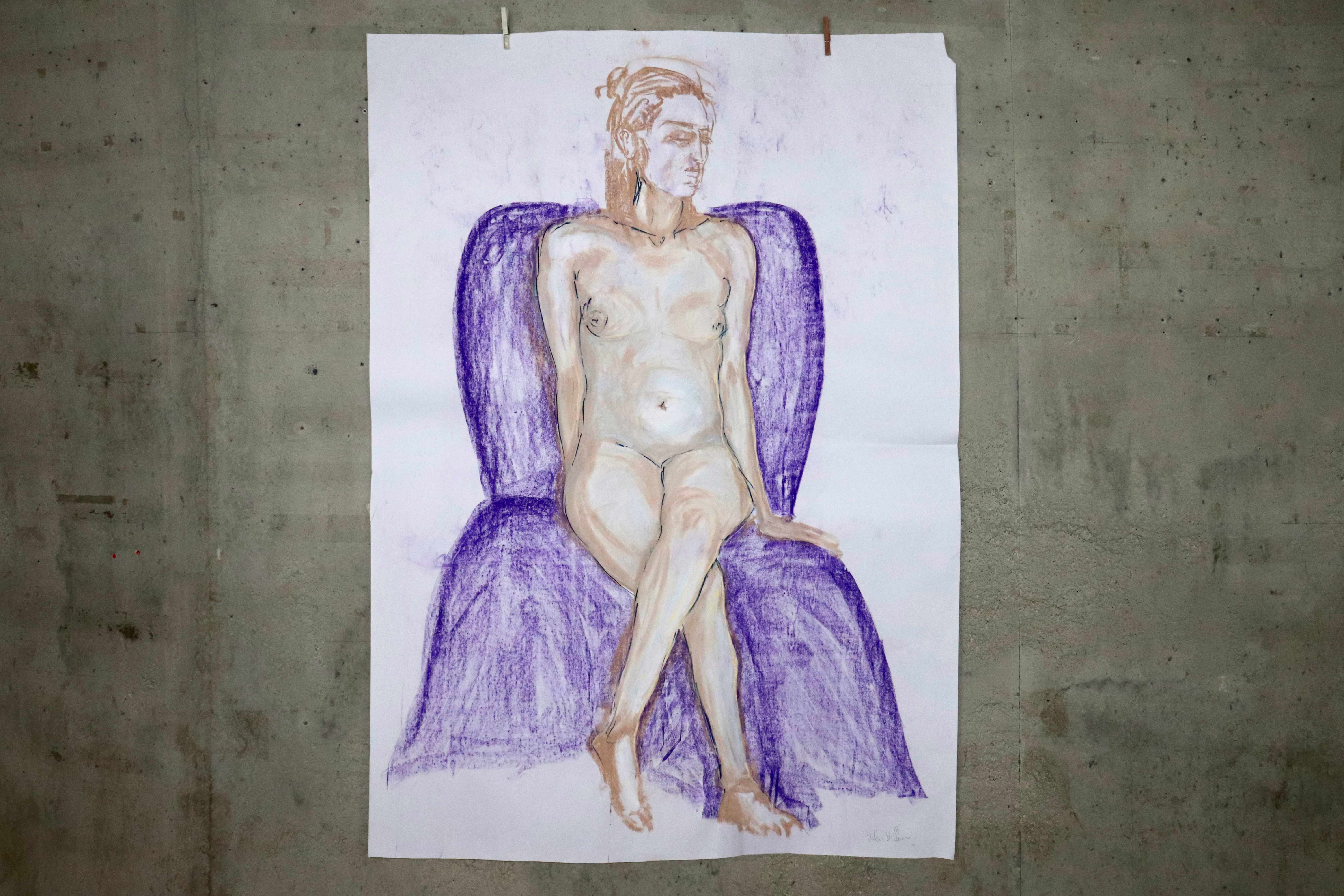 Das im Zuge eines Aktkurses entstandenes Werk, stellt eine weibliche stehende Figur dar. Die Strichführung ist expressiv und hektisch, ein körperliches Volumen wird durch das radieren von Linien gegeben. Die Figur ist im Profil dargestellt und steht breitbeinig mit verschlossenen Armen auf der linken Blattseite und blickt nach rechts. Der Charakter der Person scheint entschlossen, da ihre Körperhaltung kaum Spannung aufweist. Der Kontrast der schwarzen Linie auf weißem Blatt Papier gibt ein dramatisches Bild; eine schwarz auf weiß gegebene Tatsache. Trotzdem scheint der Körper durchsichtig zu sein, da manche Stellen in der Figur bewusst weiß gelassen worden sind. Die Komposition fußt auf ein dreieckiges Gebilde, dessen Spitze der Kopf ist. Die Zeichnung hat keinen Hitergrund, die Leere welche diese Figur umgibt zieht die Figur aus jeglicher Realität heraus und lässt sie in einem Nichts schweben. Die Zeichnung, also die Darstellung an sich, sowie die Entscheidungen dieser bestimmten Technik, können als Reaktion für die pandemiebedingte Situation stehen und wiederspiegeln das Rätsel des Seins.