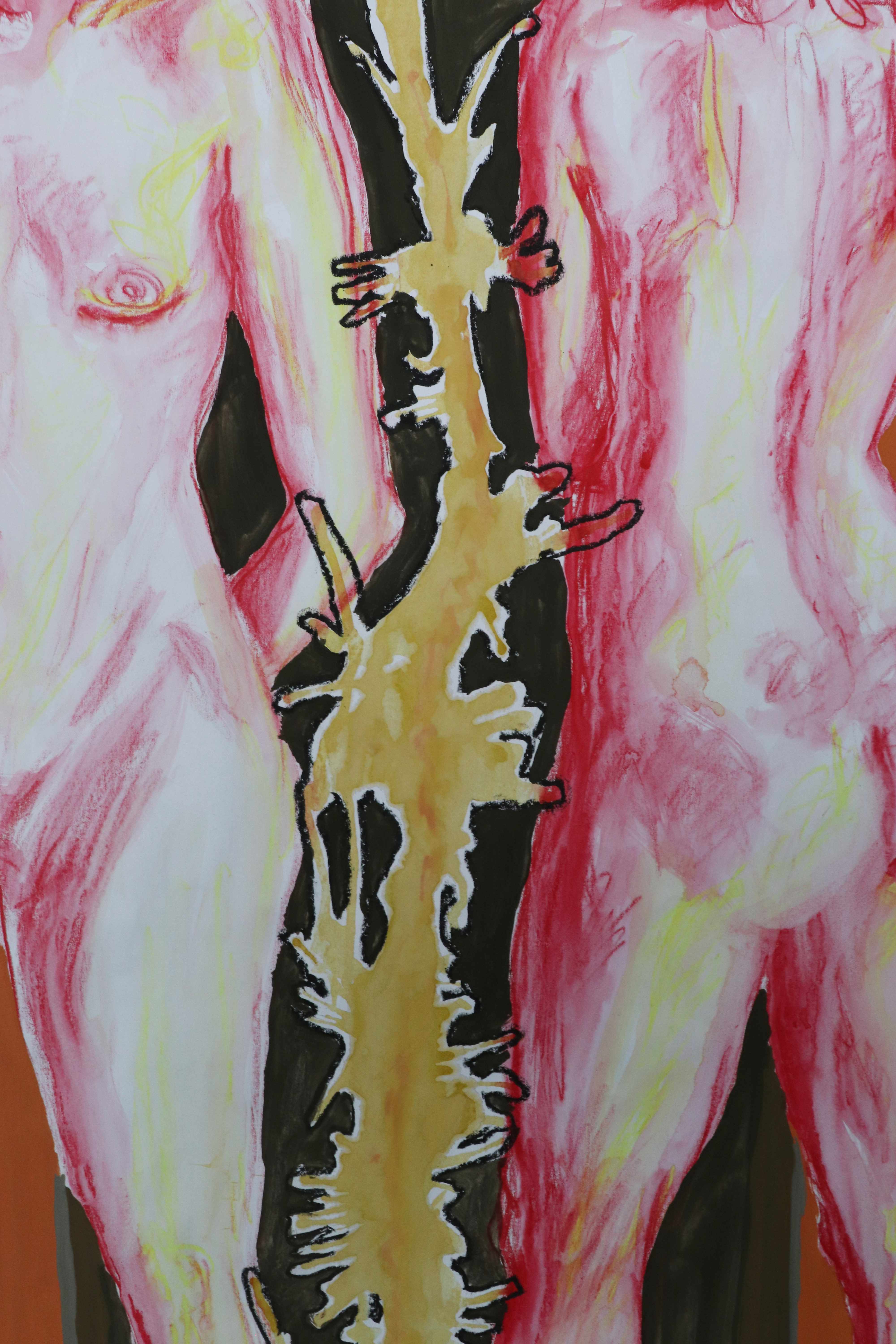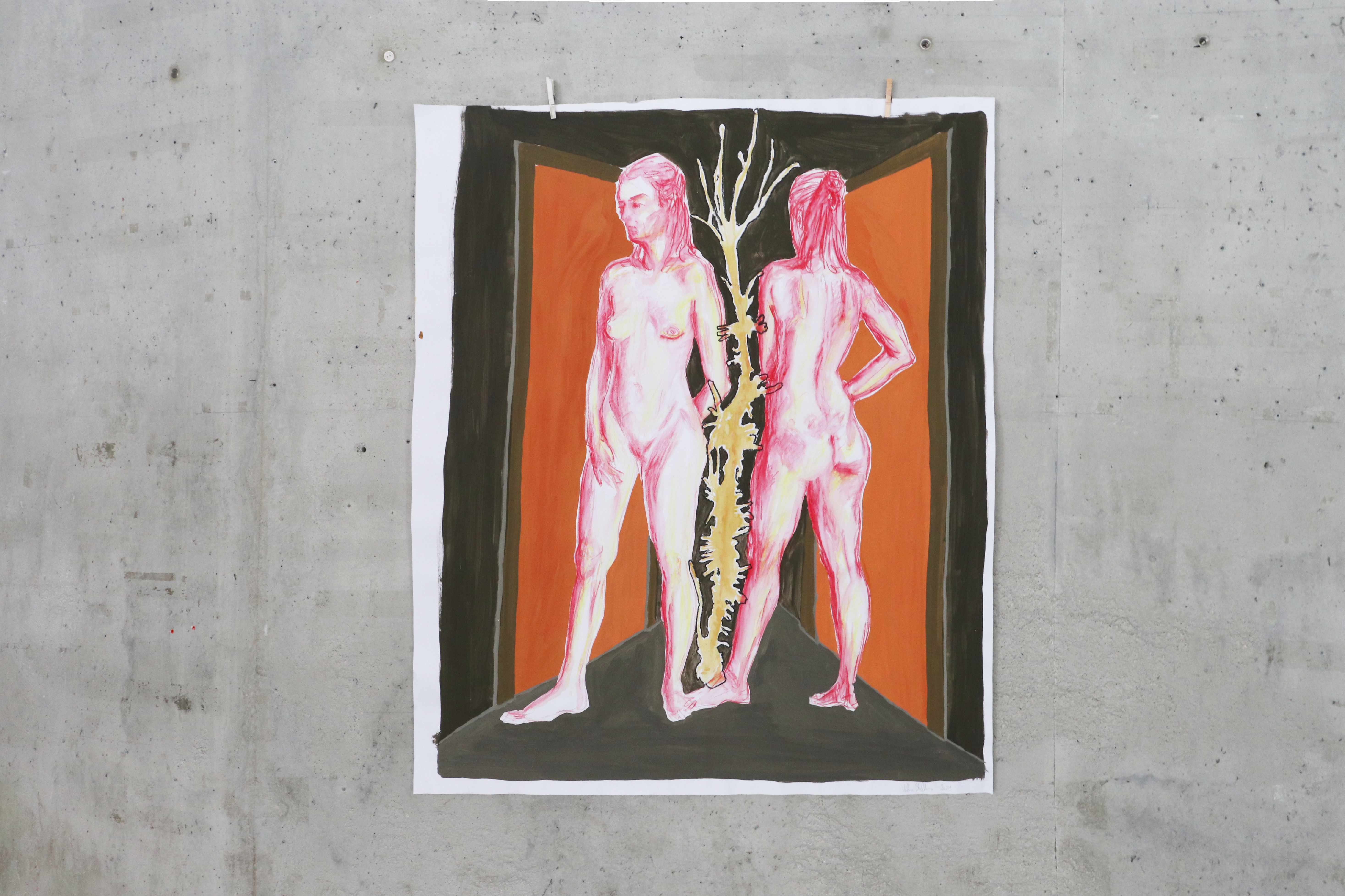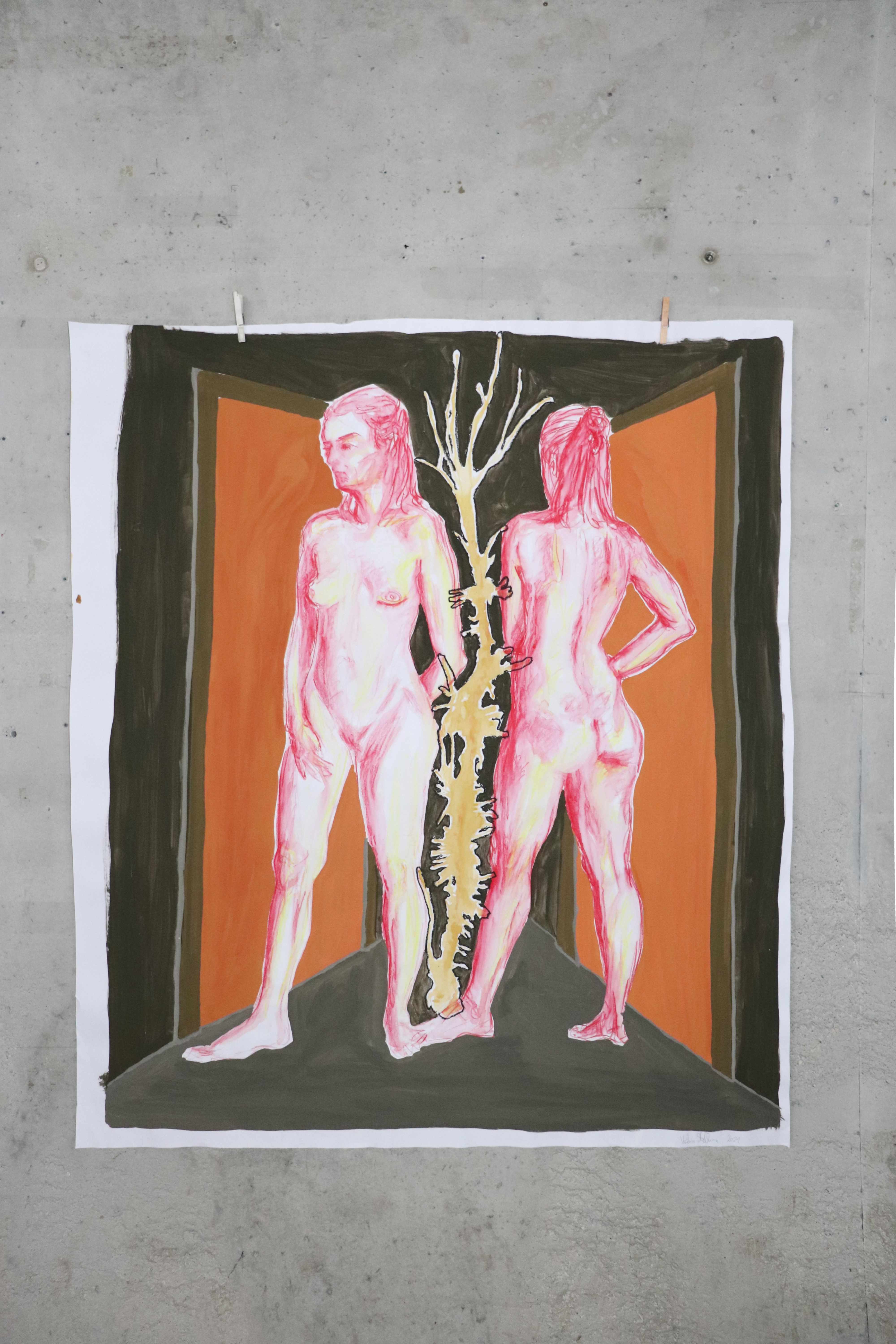 Die Malerei spielt mit der Doppelung einer einzigen Figur. Wir sehen die dargestellte Frau sei es von der Vordersite als auch von der Rückseite. Wer ist sie und wohin geht sie? Irgendwas im Bild bleibt verborgen. Die Verbindung zwischen Sein und Schein, zwischen äußerliche und innerliche Erscheinung bleibt verschleiert. Auch die beiden orangenen Tafeln im Hintergrund verweigern sich der Entschlüsselung ob es sich hierbei um Türen, also Öffnungen oder Abgrenzungen handelt. Möglicherweise befinden sich die Figuren in einem engen Flur; die eine blickt nach vorne während die andere zurückblickt. Janusassoziationen tauchen auf. Diese beiden Figuren verbindet eine amorphe pflanzenähliche Form. Diese ist als vermittelnde Form zu verstehen, welche die Furche zwischen Vergangenem und Zukünftiges deckt. Sie ist das sich ständig formende Jetzt; die nicht definierbare Zeitspanne die weder Vergangenheit noch Zukunft ist. In einer Zeit, in der die Zeit als solche, ein wichtiger Lebensfaktor geworden ist, ist das Abwarten von Zeit zu einem Alptraum geworden. Dann beziehen wir und auf Geschehenem oder richten unser Fokus auf Zukünftiges. Wir haben Begrifflichkeiten für alle möglichen Gemütszustände aber kann man das Gefühl, die Gegenwart nicht zu spüren, oder „Zeitschmerz“ begrifflich festhalten?