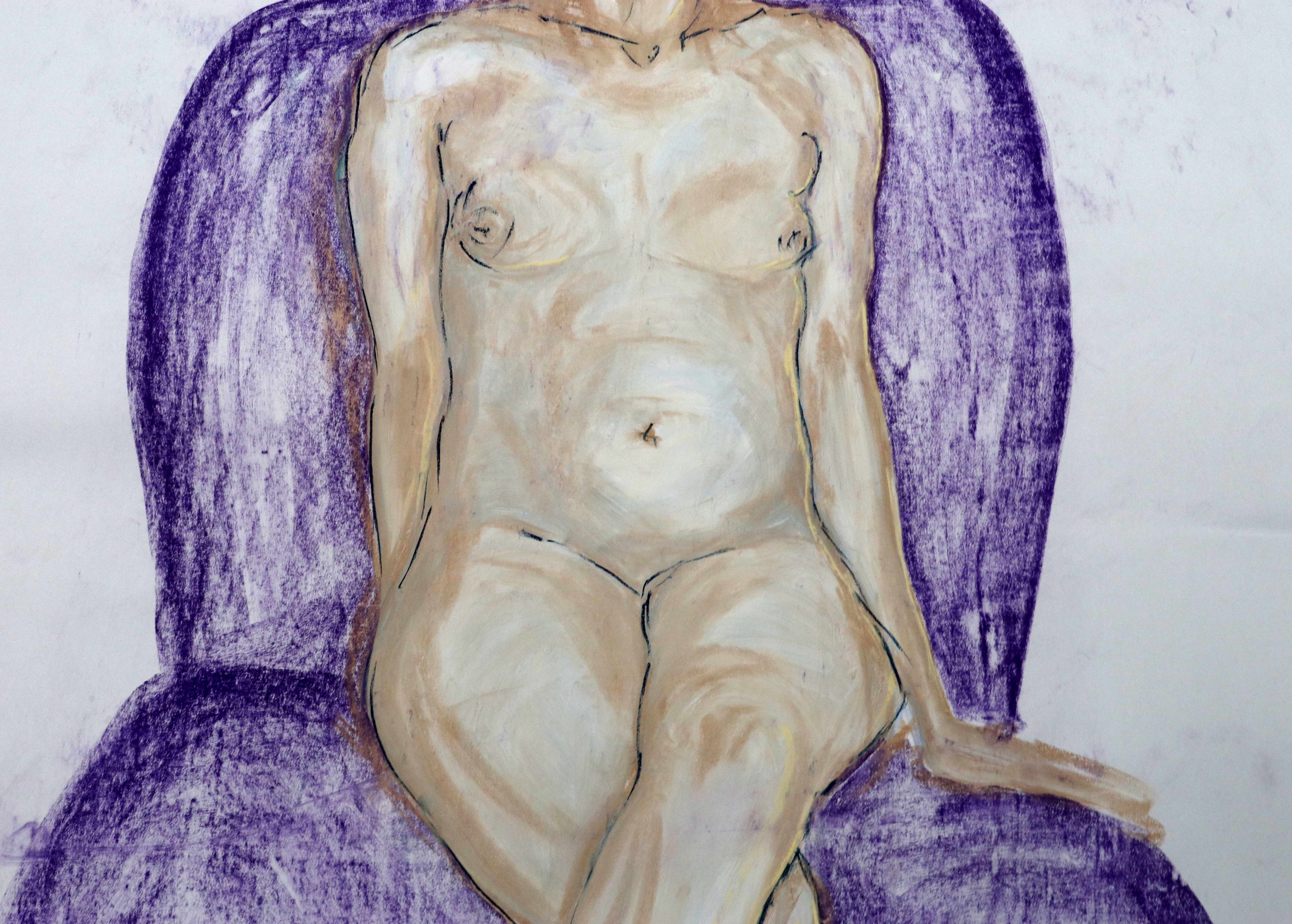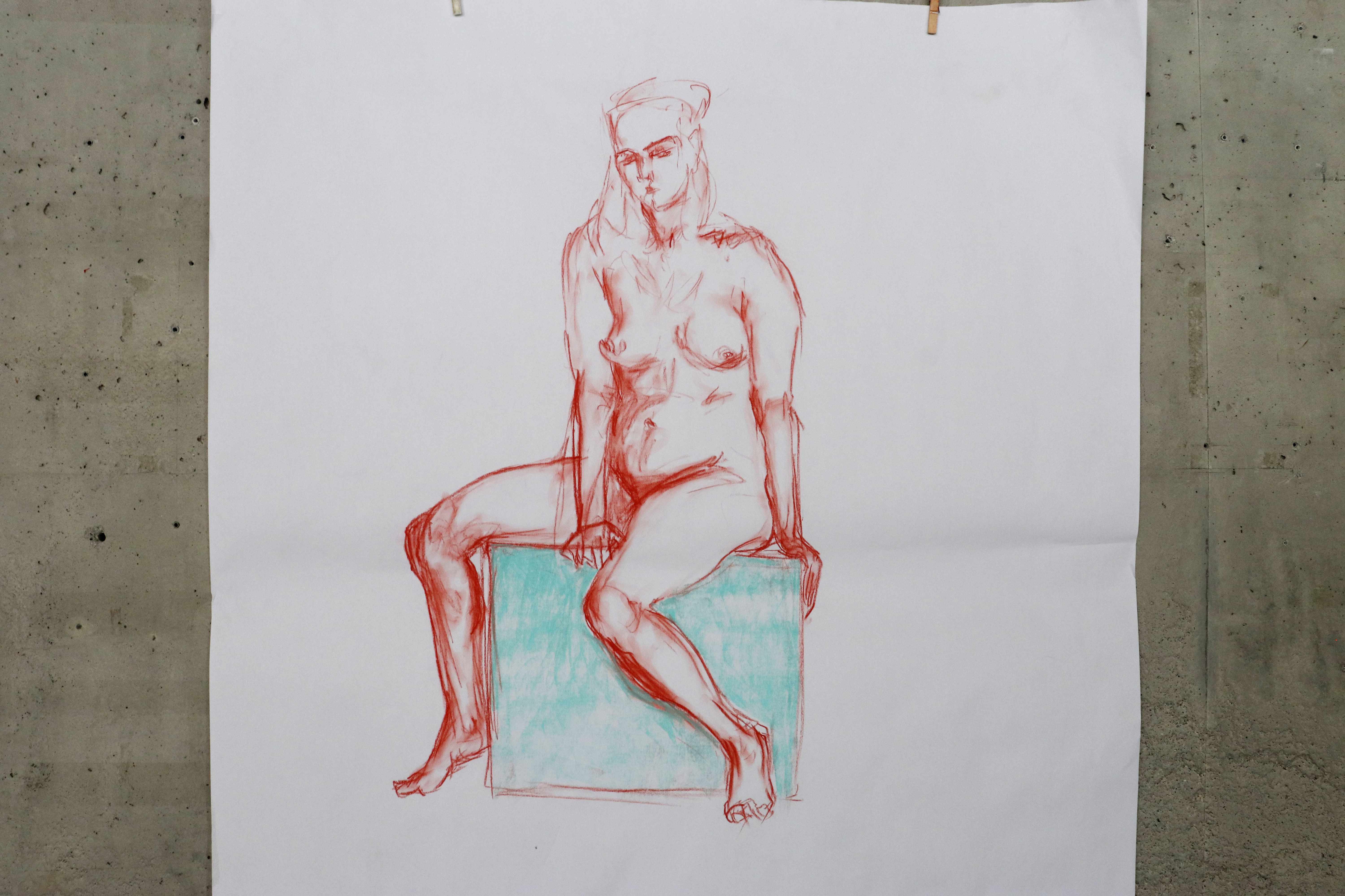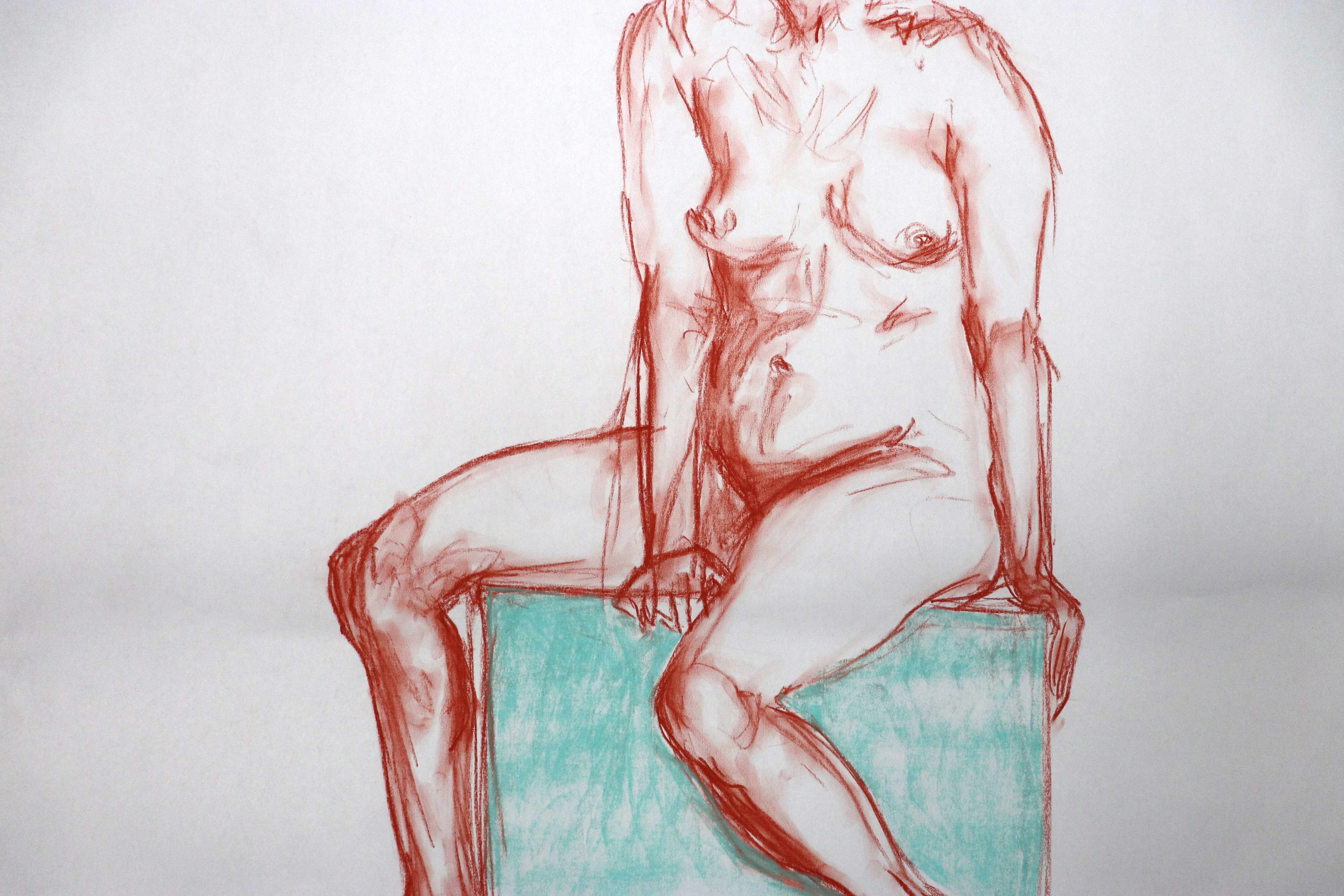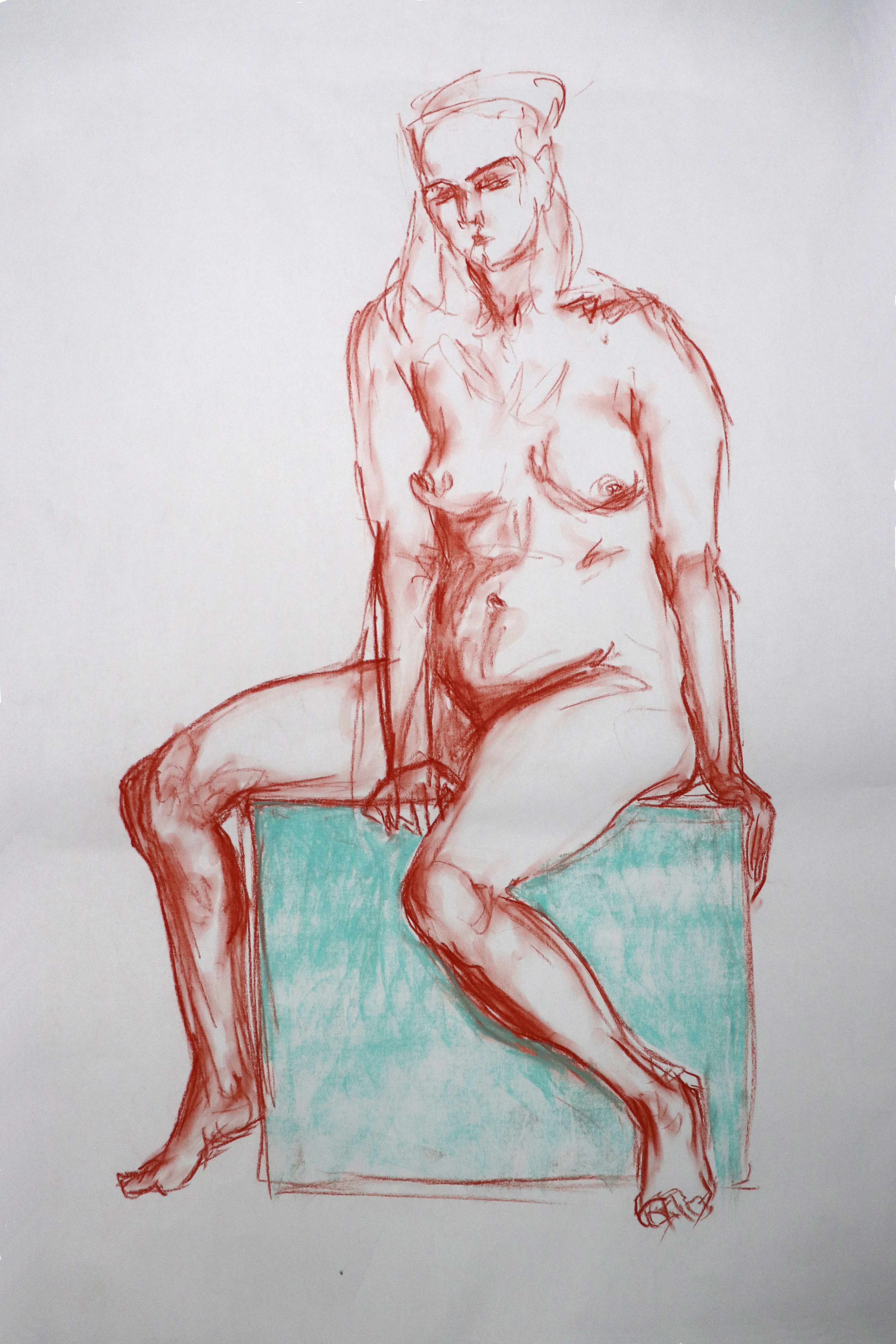 Die Zeichnung stellt eine Komposition des Körpers auf einem Würfel dar. Die Linien der Arme laufen parallel, die Beine sind angewinkelt und in einer rotierten Verschiebung angeordnet. Die Zeichnung weist einen großen Kontrast an Farbe auf: Starke Abgrenzungen deuten einen intensiven Strich an, während andere Körperflächen inhaltslos bleiben. Die Pose des weiblichen Aktes ist ausgewogen und ruhig. Die Hände, welche den Rand des Würfels festhalten verleihen der Figur eine starke Gebundenheit zum statischen Sockel. Ihre Fersen sind angehoben und berühren den Boden nicht. Das Gewicht der Beine drückt die Oberschenkel an die steife Oberseite des Würfels. Welche Körperteile sind hier nun angepannt und welche entspannt? Die Position der Figur scheint sich über mehrere kleine Stützen zu halten welche im Gesamtbild nicht ersichtlich sind. Es ist kein Bild mit klassischer Kontrapunkt Pose, sondern alle Körperteile, alle Muskeln stützen gleichermaßen; so findet das weibliche Aktmodell eine Pose die völlige Entspannung ausstrahlt, jedoch mentale und physische Arbeit dahinter verbirgt.